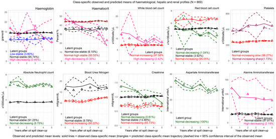 The LCMMs were used to classify the trends of haematological, hepatic, and renal parameters of all 869 participants. The analyses showed that Rayong oil spill clean-up workers had between one and four latent trends for each index.