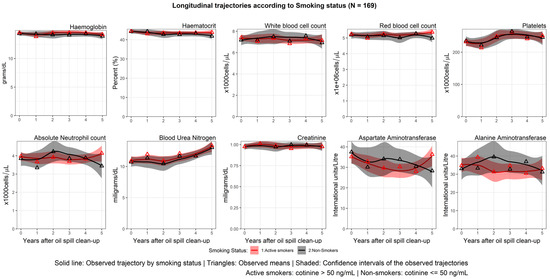 The longitudinal trajectories of haematological, hepatic, and renal parameters varied significantly according to smoking status. The average haemoglobin and haematocrit levels in non-smokers exhibited a decreasing trend over the study period, whereas the levels fluctuated in smokers.