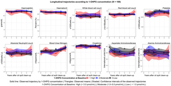 Longitudinal trajectories of the haematological, hepatic, and renal indices by the baseline concentration of 1-OHPG.