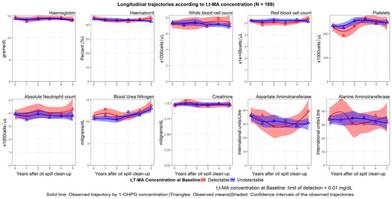 This longitudinal cohort study identified different latent longitudinal trajectories and trends in the haematological, hepatic, and renal profiles of 869 Rayong oil spill clean-up workers. Linking exposure to PAHs and VOCs, subgroup analyses assessed the longitudinal trend of the profiles among 169 cleaners with available data for urinary concentrations of 1-OHPG and t,t-MA.