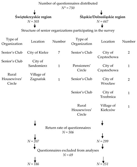 This paper is the result of a scientific study conducted under the title “Dietary habits of the elderly and their selected determinants”. The study was conducted on the basis of the KomPAN questionnaire (Questionnaire for Dietary Views and Habits), which was developed by the Committee on Human Nutrition Science of the Polish Academy of Sciences. The study was not funded by any means. The KomPAN questionnaire contains four separate sections with thematically grouped questions on eating habits; frequency of food intake; views on food and nutrition; and lifestyle, demographic and socioeconomic data [22]. The nationwide PolSenior2 survey conducted between 2017 and 2020 indicated that the prevalence of metabolic diseases, such as obesity, hypertension and type 2 diabetes, among the elderly was not significantly different in the Świętokrzyskie and Śląskie/Dolnośląskie regions. The lack of variation became the reason for selecting these regions to study the association between diet quality, demographic and socioeconomic characteristics and metabolic diseases [46]. The survey was conducted between the beginning of June and the end of September 2019. The study sample was chosen arbitrarily. A request was sent to all senior organizations (associations, foundations, clubs and senior circles) acting in the Świętokrzyskie region and Śląskie/Dolnośląskie region for consent to participate in the study. Additionally, the snowball method was applied in order to diversify the research sample of participants. Participants included in the study had to be at least 60 years old, represent one household and be able to complete the survey. A total of 750 questionnaires were distributed to sixteen senior organizations in both regions. A detailed survey sampling scheme is shown in Figure 1.