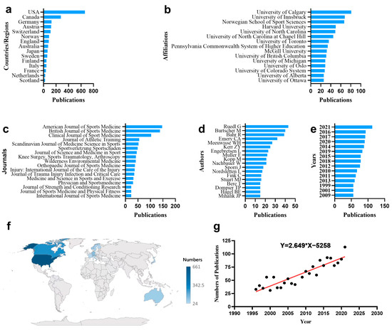 Figure 1f shows the global distribution of the number of articles. University of Calgary ranked first in number of articles (81), followed by University of Innsbruck (68) and Norwegian School of Sport Sciences (67) (