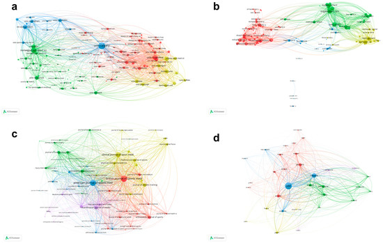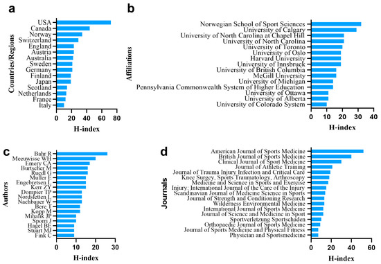 Figure 2a–d. The United States ranked first with the highest total citations (20,204), and articles with the highest average citations per item were from Norway (43.43). The United States ranked first in H-index with 72, followed by Canada (44) and Norway (34). Articles from Norwegian School of Sport Sciences had the highest total citations (3306) and H-index, which was 32. The Pennsylvania Commonwealth System of Higher Education ranked first in average citations per item (51.53). The most influential first author with the most citations (2537), the greatest average citations per article (65.05) and the highest H-index (26) in this domain was Bahr R (Norwegian School of Sport Sciences). Articles from American Journal of Sports Medicine had the highest total number of citations (8584), the greatest average citations per article (58.39) and the highest H-index (52), followed by British Journal of Sports Medicine with 5728 times, 41.51 times and 40, respectively.