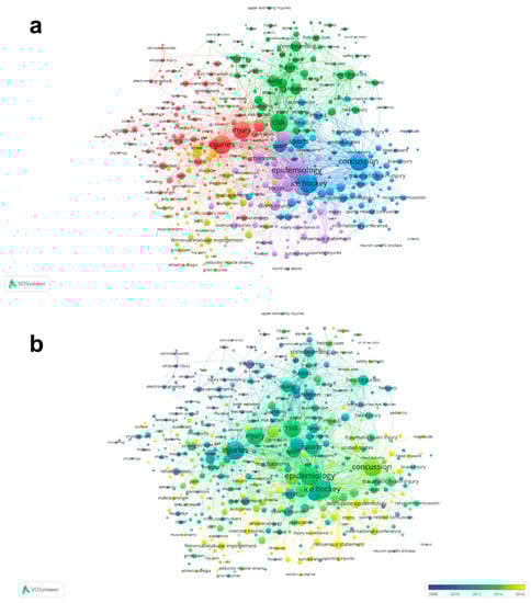 Figure 4a shows that a total of 233 identified keywords with a minimum of five occurrences were divided into five main clusters: injuries study (red color), head and neck damage study (blue color), risk study (green color), therapy study (yellow color) and epidemiology study (purple color). These categories are based on the keyword clustering algorithm generated within VOSviewer. The same color indicates that the articles are similar in terms of research content. The red cluster (123 items) includes keywords such as injuries, injury, biomechanics and performance, etc. The blue cluster (100 items) includes keywords such as ice hockey, concussion and sports, etc. In the green cluster (98 items), the most frequently appearing keywords are risk, skiing, children and snowboarding. In the yellow cluster (91 items), the most frequently appearing keywords are anterior cruciate ligament, knee and management. In the purple cluster (77 items), the most frequently appeareing keywords are epidemiology, prevention and players. An overlay visualization map was used to show the developments of keywords over time (