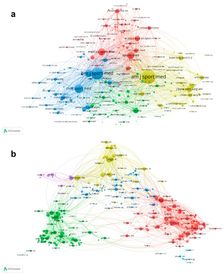 Figure 6a shows that a total of 256 journals were identified with a number of citations at least 20 times. The journal with the greatest TLS was American Journal of Sports Medicine (112,796), followed by British Journal of Sports Medicine with 83,647, Clinical Journal of Sport Medicine with 42,745, Journal of Athletic Training with 30,782 and Medicine and Science in Sports and Exercise with 29,218.