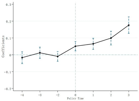 An important premise of difference-in-difference estimation is that the samples of the experimental and control groups share a common trend of change before the implementation of the policy event. Therefore, the observed differences between the two sample groups are fragmented due to policy treatment effects. To ensure the validity of the DID model, referring to Beck et al. [47] we next construct the following model to verify whether the samples satisfy the parallel trend assumption.
