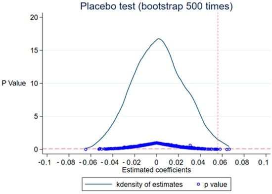 To confirm that the findings of the baseline regression were not due to random factors, referring to Bradley et al. [54], we randomly selected 22 cities from all sample cities as the pseudo-experimental group (cities with river chief system implementation) for the placebo test. Specifically, in each regression, 22 cities were randomly selected from the sample of 42 cities as the pseudo-treatment group, and these cities were assumed to be the cities where the river chief system was implemented. The remaining cities were assumed to be the pseudo-control group, which did not implement the river manager system. Since the pseudo-treatment group is randomly selected, the pseudo-river length system variable generated by the pseudo-treatment group does not significantly affect GTFEE, i.e., the estimated coefficient = 0. That is, the regression coefficient will not be significantly different from 0 if it is not a random factor that leads to the findings of the baseline regression. Conversely, it indicates that the findings of this paper are affected by the influence of random factors. Additionally, to avoid the interference of other small probability events on the estimation results, we repeat the above process 500 times. Figure 2 reports the P-value distribution and the probability density of the estimated coefficient for the 500 randomly selected treatment groups. The results in Figure 2 show that the mean value of the estimated coefficient is close to 0 and concentrated around 0 in an approximately normal distribution, and the true estimated coefficient 0.053, represented by the vertical line in Figure 2, is at the edge of the normal distribution in Figure 2. This result implies that the pseudo-rivermaster variable does not significantly affect GTFEE and the main regression results of this study are not influenced by random factors.