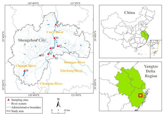 Eight sampling sites were picked to represent the water quality of Shengzhou according to the location and data integrity; the locations of the sites are shown in Figure 1. Site 1 (S1) was located in Chengtan River, representing the water quality of Chengtan River and Shengzhou’s inbound water quality. For the tributaries, Site 2 (S2) was distributed along Xinchang River. Site 3 (S3) and Site 4 (S4) were distributed along Changle River. Changle River is the longest tributary in Shengzhou with the largest watershed area; accordingly, two sites were chosen. Site 5 (S5) was distributed along Huangze River. Site 6 (S6) and Site 7 (S7) were located in the mainstream of Cao’e River. Site 6 was located downstream of the confluence of the important tributaries, the beginning of the mainstream of Cao’e River, where the water flow becomes larger. Site 7 was near the border of Shengzhou, regarded as the outbound water quality. To measure the state of the important drinking water source, Site 8 (S8) of Nanshan Reservoir was taken into account.