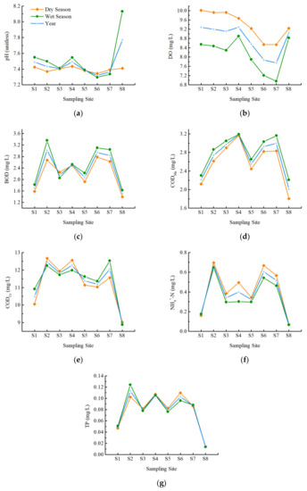 Water quality levels according to years, as well as dry and wet seasons, in each sampling site. (a). pH; (b). DO; (c). BOD; (d) CODMn; (e) CODCr; (f) NH4+-N; (g)TP.
