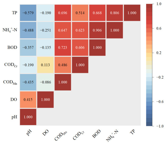 In addition, there were also medial correlations between CODMn and TP (cc = 0.696), and between BOD and TP (cc = 0.668). It can be inferred that the TP was mainly composed of organic phosphorus compounds. The correlations among NH4+-N, TP, and organic indicators were consistent with the developed agricultural background in the research area.