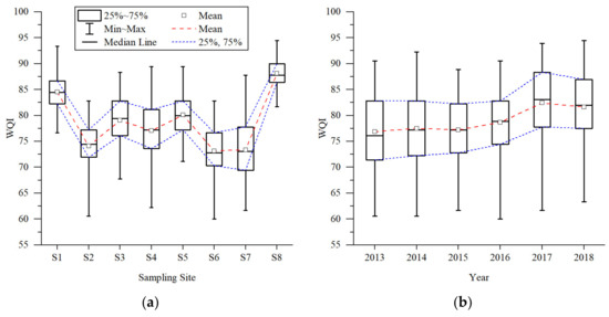 Box charts for WQIs of sampling sites (a) and study period (b).