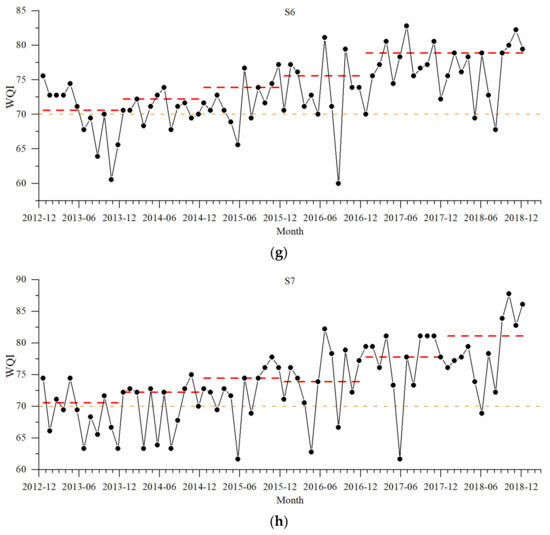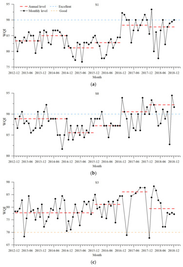 - The monthly WQIs were all high, with S1’s monthly WQIs above 75 and S8’s monthly WQIs all more than 80. Some monthly WQIs were even above 90, reaching the “excellent” standard.