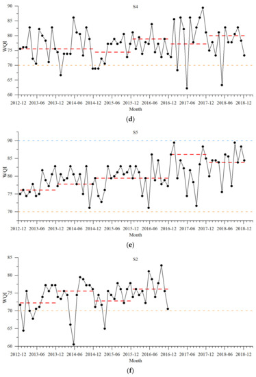 - There were more points with monthly WQIs less than 70 at the three sites, the water quality of which was “medium”. S2 had the lowest value in 2014-06, while the lowest value of S6 was in 2016-09, and that of S7 was in 2015-06 and 2017-06.