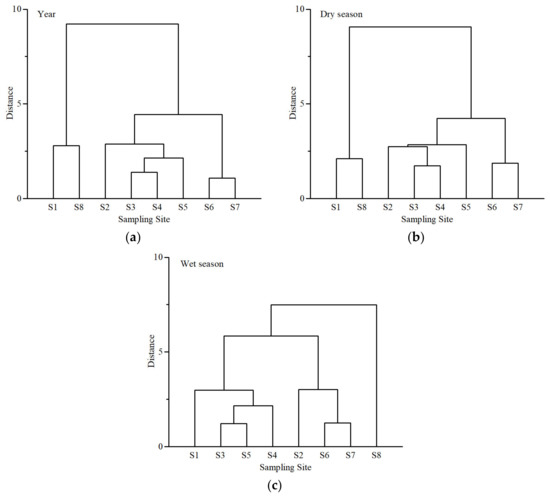 The multiyear average and multiyear seasonal average water quality parameters of the eight sampling sites in the study area were categorized spatially on the basis of hierarchical cluster analysis, according to the comprehensive similarity of water quality parameters. Figure 6 includes three clustering dendrograms, displaying the water quality clustering results of all years, as well as the dry and wet seasons.