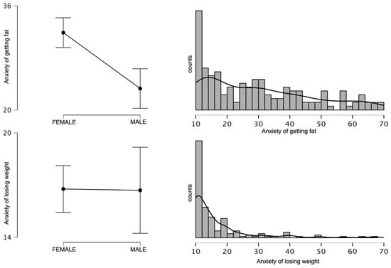 Figure 1 shows the distribution of the variables of the weight change anxiety components and mean values in the study sample by gender. Gender statistically significantly differentiated the mean scores on the AGF scale (p < 0.01), while no statistically significant differences were noted on the ALW scale. The mean AGF score in the female group was higher (M = 31.88; SD = 17.64) than in the male group (M = 23.30; SD = 13.09). For these comparisons, Cohen’s d was 0.52. The observed effect size was classed as medium []. Although no gender differences were found in the ALW scale, it is important to note the differences in the distribution of the ALW variables in relation to the AGF. As can be seen in Figure 1, the frequency distribution of the AGF variables was flat with the highest frequency of the minimum value. In contrast, for the ALW scale, the values decreased more sharply and higher values in this scale occurred less frequently than in the AGF scale. In addition, for the AGF, the scatter of results was similar for both sexes. For the ALW, despite the lack of differences in mean values, the range of achievement among men was much greater. Despite the lack of gender-related differences in the mean values, higher scoring individuals on the ALW scale could be expected in the male group. Higher values of weight gain anxiety among women have also been confirmed in other studies. In addition, the impact of stereotypes and negative attitudes associated with obesity as confirmed in other studies is also stronger in women [,,]. Fear of weight loss is such an under-researched construct, that we were unable to find studies presenting its gender dependence.