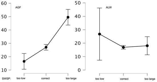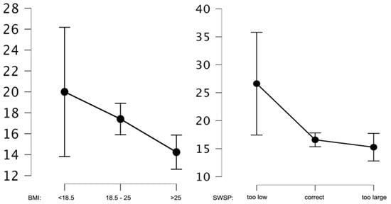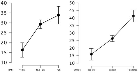 In the next step, the mean values of the weight gain anxiety were analyzed in relation to the correctness of one’s body weight as assessed by BMI and subjective body weight assessment. The analyses indicated that both BMI and SWSP significantly differentiated the subjects in terms of their level of weight gain anxiety. Statistically significant differences were shown for BMI groups below normal BMI and normal BMI (p < 0.01), as well as below normal BMI and above normal BMI (p < 0.01). Only for the comparison of normal BMI and above normal BMI groups was no statistically significant difference shown (p = 0.07). In contrast, the comparison of the groups in terms of SWSP showed significant differences in AGF levels for all three groups at p < 0.01. Graphs showing mean analyzed values are shown in Figure 2.