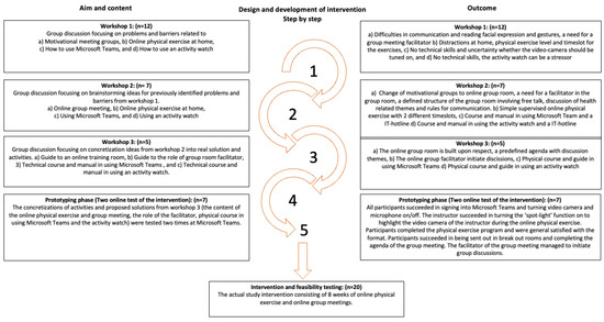 The rationale of developing the intervention was inspired by the findings of Thorsen et al. [6].The study found three central themes as barriers to physical activity: (1) Physical activity conflicts with everyday life, (2) lack of physical activity opportunities and possibilities in technology, and (3) lack of community and social support. Together with the co-creation approach, these three themes created the framework for the intervention in this study. Firstly, the framework for the proposed intervention involved a physical exercise intervention that the participants could assess from their own digital device in different timeslots of a weekly day. Furthermore, the Garmin Vivofit 4 activity watch was suggested for the intervention due to its utility: small size, one year of battery life, price, and widgets. Secondly, following the online physical exercise session, it was proposed that the participants were divided into small online groups to establish relationships and social support. Lastly, the participants decided the content and agenda of the group room together. The intervention intended to initiate engagement in physical activity and support participants’ ability and motivation to increase and maintain daily physical activity by themselves.