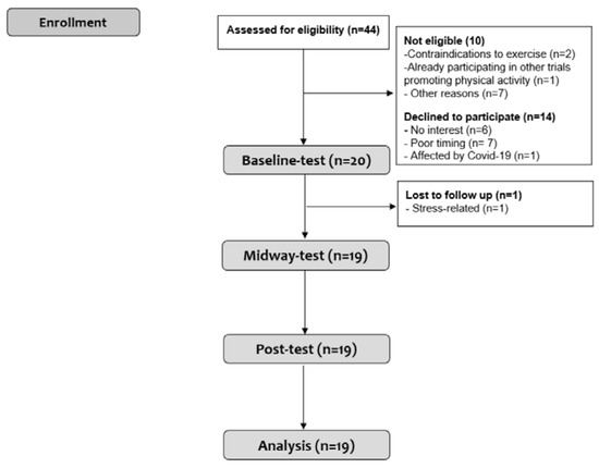 A total of 44 individuals were assessed for eligibility from 14 February to 10 March 2022, 20 participants were allocated to the intervention, and 19 participants were included in the analyses (Figure 2).