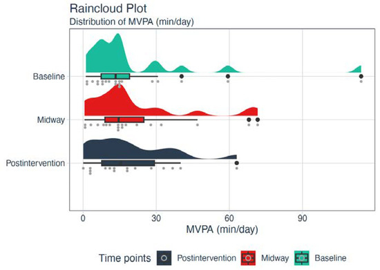 Raincloud plot representing an illustration of data in a half-density distribution (the ‘cloud’) with individual raw data (the ‘rain’) and a boxplot below the ‘cloud’ of the total daily moderate to vigorous physical activity (MVPA) in minutes at baseline, midway, and post-intervention.