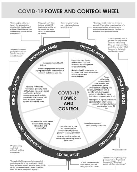 The interview results suggested that COVID-19 may be perceived as mirroring the power and controlling aspects of IPV. We present a substantial overlap between the emotional abuse perpetrated by a controlling partner and the impact of public health guidance and fears of infection from COVID-19 (see Figure 2). Comparable to the bodily harm of physical violence, postponing healthcare due to a fear of infection or acquiring care in an over-burdened healthcare system can result in adverse physical health effects. Power differentials (privilege) between clients and providers are intensified given restrictions on healthcare access and strict protocols for accessing services. Like a violent perpetrator, COVID-19 restrictions limit access to sexual healthcare, safe-sex supplies, and contraception choices. Support system access is limited by ‘healthy at home’ ordinances. Other commonalities include the menacing appearance of PPE and a lack of control of finances with employment disruptions. Retraumatization may further exacerbate the psychological and physical impacts brought on by the pandemic in addition to triggering survivors of IPV. These findings suggest that the Duluth Model of Power and Control [] may be useful as a framework through which practitioners can understand and more directly address the possibility of re-occurring trauma due to COVID-19 and future pandemics and which offers the following tangible suggestions for service providers [,]: