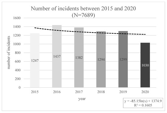 The frequency of recorded incidents between 2015 and 2020 is presented in Figure 1. The highest number of forensic examinations was conducted in 2016. (n = 1437) and the fewest in 2020 (n = 1030). The reason for the low number of examinations conducted in 2020 might result from the start of the COVID-19 pandemic, the restrictions and limitations introduced, and thus the lower frequency of reporting by victims of incidents, as well as reducing the activities of Forensic Medicine Department in Poznan and the related cessation of examinations from March 22 to May 15. Disregarding the exceptional year 2020, due to the events mentioned above, the number of incidents oscillates at a similar level during the period under review.
