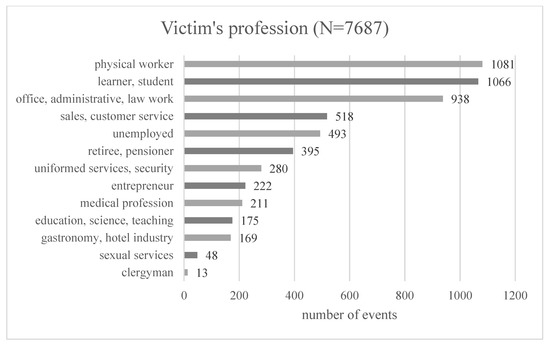 The professional profile of victims reporting for medical examinations was also analyzed. Data are shown in Figure 2. Regarding the 5609 occupations reported (unknown occupations were not included), the most significant proportion were physical workers (19.3%) and students (19%). Subsequently, office workers had the highest number of injuries, accounting for 16.7% of victims. The unemployed were victims in 8.8% of the discussed cases.