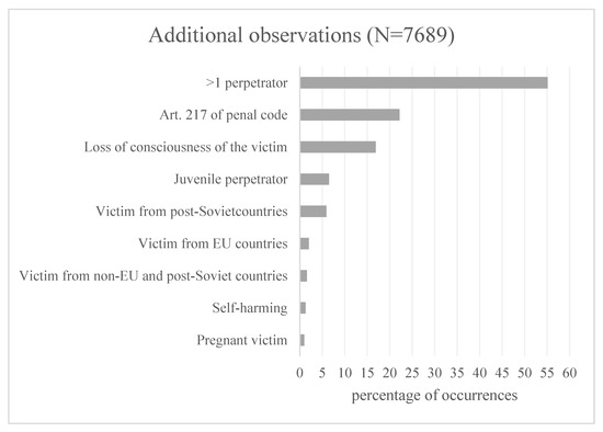 Additional remarks include information the authors found interesting and important for future studies that were not matched to the main categories, such as incidents committed by more than one perpetrator, juvenile perpetrators, pregnant victims, or victims’ ethnicity.