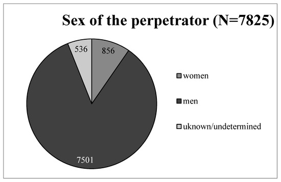 As reported by the victims, the perpetrators were most often men (84.3%), and only 9.6% of the noted cases were women (Figure 4).