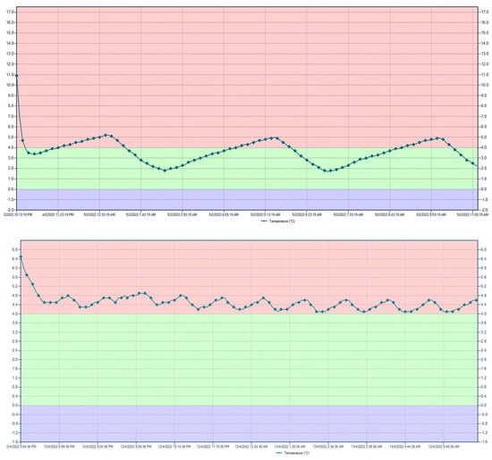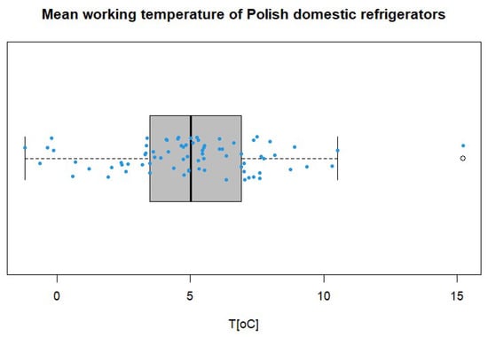 Participants were provided with a temperature data logger (LogTag model TRIX-8, LogTag North America Inc., Auckland, New Zealand) and instructed to place it on the middle shelf of their refrigerator for 24 h. Participants were told not to change their refrigerator settings and to perform the measurement under normal usage conditions. This aimed at obtaining a realistic temperature data set that reflected everyday use and conditions. The survey carried out included 77 participants, inhabitants of Lodz in Poland, and took place from January to July of 2022. The data logger took temperature readings at 5-minute intervals, and these data points were used to calculate the mean temperature, standard deviation, minimum and maximum values for each refrigerator.