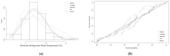 The recorded mean temperature values were statistically analyzed to find the best-fitting probability distribution to describe the variability of Polish household refrigerator working temperatures. The probability distribution fitting was performed in R with the fitdistrplus package. Fitting was performed for the Weibull, triangular, lognormal, pert, and normal distributions, with parameters being estimated by using the maximum likelihood estimation (mle) method. All distribution fitting scenarios were statistically tested for goodness-of-fit. To select the distribution which best described the data, the Chi-squared, Kolmogorov–Smirnov (KS), Cramér–von Mises (CVM), and Anderson–Darling (AD) statistics were calculated alongside the Akaike’s Information (AIC), and Bayesian Information Criteria (BIC). These values were compared for all fitted distributions to confirm the best fit.