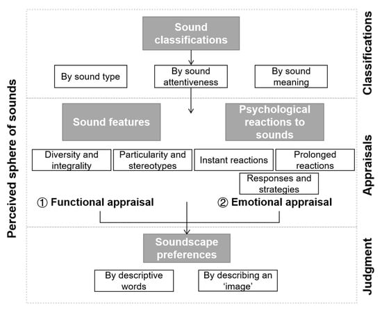 The perceptual structure generated in this study has associations with previous research in the environmental psychology field. The process of perceiving sounds corresponds to Rapoport’s [] process of how people perceive the physical environment, which consists of the cognitive, affective, and conative levels, that is, knowing something, feeling something, and then doing something about it. The four aspects of the perceptual structure correspond to three levels: sound classifications and features represent how users receive and understand sounds at the cognitive level; psychological reactions are at the affective level, including feelings and emotions stimulated by the sound environment; preferences reach the level of judgment and choosing, which represent the conative level.