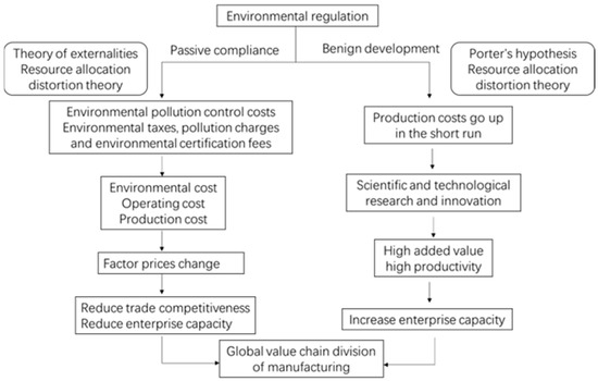The analysis of passive compliance is based on the externality theory and resource allocation distortion theory [19,20]. The core idea of the above-mentioned theories is that environmental regulations make the manufacturing industry spend more on pollution control, such as the purchase of environmentally friendly equipment and the improvement of production processes leading to higher costs. Moreover, pollution taxes, charges, environmental certification, and other fees will lead to an increase in operating costs. In order to adapt to the change in cost, enterprises need to change their allocation of production factors in time, and optimize the efficiency of resource allocation. Therefore, the price of production factors has also changed [21], which has two impacts on the GVC position of manufacturing enterprises. On the one hand, it may reduce competitiveness in trade due to higher costs. On the other hand, it has squeezed the profits of enterprises and reduced their production capacity to some extent. In the short run, enterprises do not have enough funds to complete the optimal allocation of production factors and improve their position in GVC [22,23,24,25,26,27,28,29].