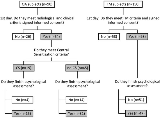 Flow chart of the selection sample process. Note: OA: osteoarthritis, FM: fibromyalgia, OA-CS: osteoarthritis with central sensitization, OA-noCS: osteoarthritis without central sensitization.