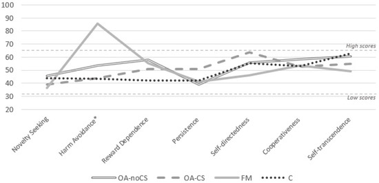 The outcomes of the logistic regression between OA-CS and OA-noCS and between FM and OA-CS show no statistical significance in their profiles. We also performed logistic regression in every subdimension of each temperament, and character dimensions where we found no significant differences.
