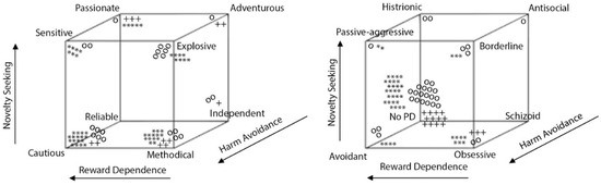 Temperamental profile and personality disorders in TCI-R for different groups of patients. Note. TCI-R: Temperament and Character Inventory, +: osteoarthritis with central sensitization, o: osteoarthritis without central sensitization, *: fibromyalgia. Multiple *, o, + implies greater number of cases. PD: personality disorders (histrionic: excessive attention-seeking behavior; passive-aggressive: procrastination, covert obstructionism, inefficiency and stubbornness; avoidant: avoidance to feared stimuli; obsessive: excessive need for orderliness, neatness, and perfectionism; schizoid: lack of interest in social relationships; borderline: extreme moods, fluctuating self-image, and erratic behaviors characterized by impulsive actions; antisocial: pervasive and persistent disregard for morals, social norms, and the rights and feelings of others.