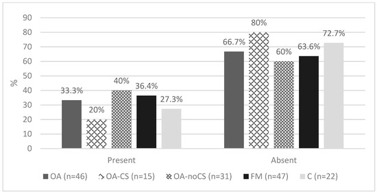 Presence/absence of TCI-R personality disorders by group. Note. TCI-R: Temperament and Character Inventory, OA: osteoarthritis, OA-CS: osteoarthritis with central sensitization, OA-noCS: osteoarthritis without central sensitization, FM: fibromyalgia, C: control.