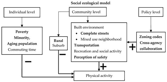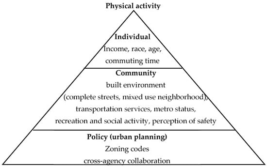 This study uses the socio-ecological model to estimate key factors at the individual, community, and policy levels that are related to physical activity (Figure 1). At the policy level, urban planning literature identifies the role of zoning [,] and cross-agency collaboration [,,,] in promoting community health. At the community level, research shows that physical activity is related to community features, including mixed-use neighborhoods, transportation services, complete streets [,,], recreation and social activity [,,,], perceptions of safety [,,], and metro status [,,]. We use demographic structure to capture the individual level, including income, race, age, and commuting time. Our theoretical framework assesses multilevel and multidimensional factors related to physical activity (Figure 1).