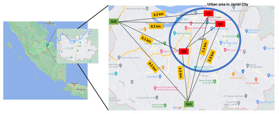 Study sites and selected schools (U1, U2, U3, SU1, and SU2) in Jambi city, Indonesia.