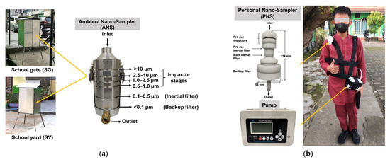 (a) Ambient Nano-Sampler (ANS) and (b) Personal Nano-Sampler (PNS) and description of use in field samplings.