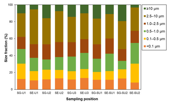 Average percentage of size fractions (particle size: <0.1 µm, 0.1–0.5 µm, 0.5–1.0 µm, 1.0–2.5 µm, 2.5–10 µm, and ≥10 µm) to total particles (TSP) at SG and SE in each school.