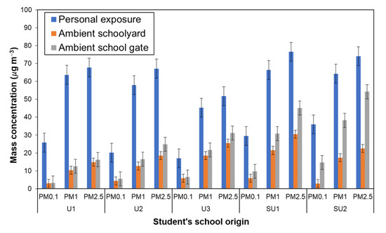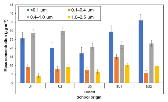 Figure 4 shows the average mass concentration of size-segregated particles down to PM0.1 that the schoolchildren were exposed to for each school. Although, because of individual differences, the actual average duration of exposure measurement was 11.8 ± 0.5 h, the average concentration value may be acceptably regarded as the 12-h time-weighted average (12-h TWA). The exposure to PM0.1 and PM0.4–1 appeared to be dominant-size fractions in most cases, in which the PM0.1 accounted for around 40% of PM≤2.5, i.e., fine particles, with an average PM0.1 exposure of 25.9 ± 10.1 µg m−3. The schoolchildren in suburban areas were exposed to PM0.1 more heavily, exceeding 50 µg m−3 for some children from the SU2. These high levels of PM0.1 are comparable to ambient PM levels during remarkable episodes such as in Chiang Mai city, during the forest fire periods in 2014–2015 in northern Thailand [65] and during the peatland fire season in 2019 in Sumatra, Indonesia [36].