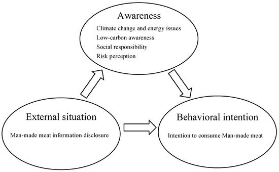 A literature review revealed that most studies have focused on determining the factors influencing the public’s intention to consume man-made meat, whereas few have explored the relationship between these factors from an integrated perspective and the pathways through which they act on consumption intention. Moreover, public awareness or quality remains a weak link in the current environment of climate change and resource utilization and has become one of the biggest barriers to low-carbon development in China. Raising public awareness of low-carbon living and promoting public low-carbon consumption behavior has become a crucial strategic task and central mission. So far, few studies have been conducted that consider the influence of psychological factors on low-carbon consumption intention from the perspective of public awareness. Behavioral decisions (or behavioral intentions) are governed by the public’s perception of things, which in turn is influenced by the external environment. Therefore, this study takes information disclosure (ID) as an external variable. With the help of the “awareness-situation-behavior” theory [12], it is of great value to comprehensively study the influence of ID on the public’s intention to consume man-made meat.