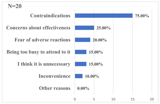 In general, 4613 questionnaires were collected over the study period. After excluding invalid questionnaires, a total of 3916 participants were included in the study (Figure 1). Table 1 summarizes the characteristics of the sample. More than half of the respondents were female (64.56%), 83.09% were 23 years and younger, only 9.91% were graduate students, and 22.06% majored in medicine. The coverage of first-dose vaccination was 99.49%. A total of 75.00% of the 20 unvaccinated students did not receive at least one dose of vaccine because of contraindication, which was the most common reason (Figure 2).