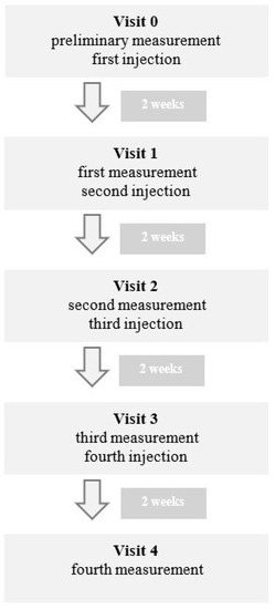 During the first visit, called visit 0 in table and graph, preliminary measurements were performed. During the same visit, the patients were injected with atelocollagen according to the previously described scheme. Every two weeks, new measurements were taken before the subsequent injection, with a total of four injections for every patient. The final measurements were taken two weeks after the fourth injection, during visit 4 (Figure 1).