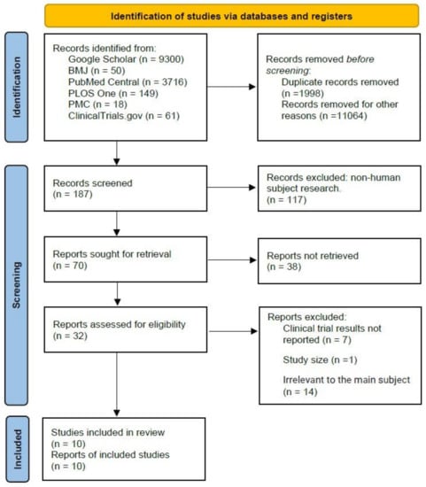 Using the PRISMA flowchart, of the 13,294 research articles identified through database searching, 187 were screened after removing duplicates (Figure 1). The second step of removing articles was excluded by physical checks (n = 11), the report sought for retrieval (n = 70), and reports that were not accessible for not having the full text (n = 38). The third step of screening was to exclude clinical trial results not reported (n = 7), very small study size (n = 1), or unrelated to the study objective (n = 14). This screening process yielded a total of 10 studies for final review.