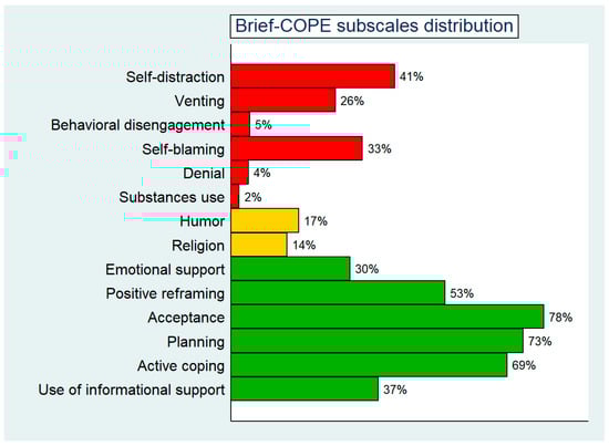 Brief-COPE subscales distribution in the whole sample. Avoidant coping subscales are colored in red, active coping subscales in green, and neither active nor avoidant coping subscales in yellow, respectively. The frequencies for each coping strategy are reported on the right side of each bar as percentages.