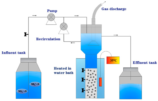 In this study, synthetic wastewater was used, composed of nitrogen and inorganic carbon sources [2]. NH4+-N and NO2−-N were provided by two compounds, NH4Cl and NaNO2, respectively. The trace elements included EDTA (15 g L−1), FeSO4·7H2O (5 g L−1), H3BO4 (0.014 g L−1), MnCl2·4H2O (0.99 g L−1), CuSO4·5H2O (0.025 g L−1), ZnSO4·7H2O (0.43 g L−1), NiCl·6H2O (0.19 g L−1), NaMoO4·2H2O (0.22 g L−1), NaSeO4·10H2O (0.123 g L−1), CoCl2·6H2O (0.3 g L−1), and NaWO4·2H2O (0.664 g L−1). The synthetic wastewater was purged with N2 for about 20 min to obtain anaerobic conditions, and its dissolved oxygen concentration was controlled within 0.2 mg/L.