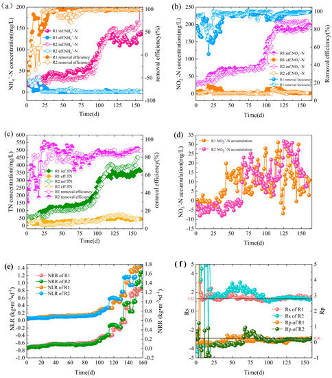 Long-term performance of nitrogen removal in the reactors. Concentrations and removal rates are shown for NH4+-N (a); NO2−-N (b); total nitrogen (TN) (c); and the ΔNO3−-N accumulations (d); variations of nitrogen loading rate (NLR) and nitrogen removal rate (NRR) (e) and of Rs (ΔNO2−-N/ΔNH4+-N) and Rp (ΔNO3−-N/ΔNH4+-N) (f).