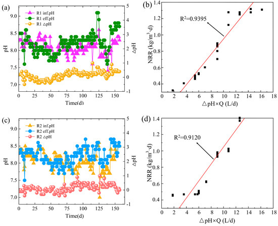Changes in pH of R1 during start-up (a) and its relationship with nitrogen removal (NRR) (b); changes in pH of R2 during start-up (c) and its relationship with nitrogen removal (NRR) (d).