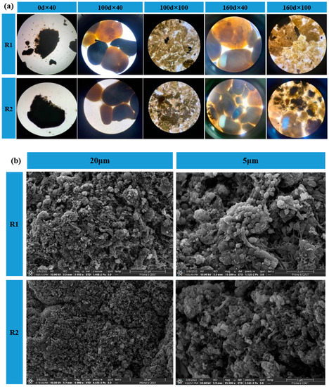 As seen in Figure 4a, the inoculated AGS had a clear boundary and dense structure, similar to the observations made by other researchers [24,25]. After 100 days of domestication, they were removed from the bottom of the reactor and observed using microscopy at 40× and 100× magnification, respectively. The observations showed that the proportion of granular sludge with yellowish-brown color increased in the R1 and R2 reactors, which proved that the color change of granular sludge was a surface-to-surface process, presumably since the surface layer of granular sludge was more accessible to the sufficient substrate for metabolism, which was the same as the results of Liu et al. [26].At the end of the domestication period, microscopic observation of the samples retaken revealed that the color of granular sludge in both R1 and R2 reactors was predominantly reddish-brown, containing very little black granular material, which was presumed to be inorganic salt precipitates, and the formation of inorganic precipitates in granular sludge would accelerate the process of sludge granulation [27].